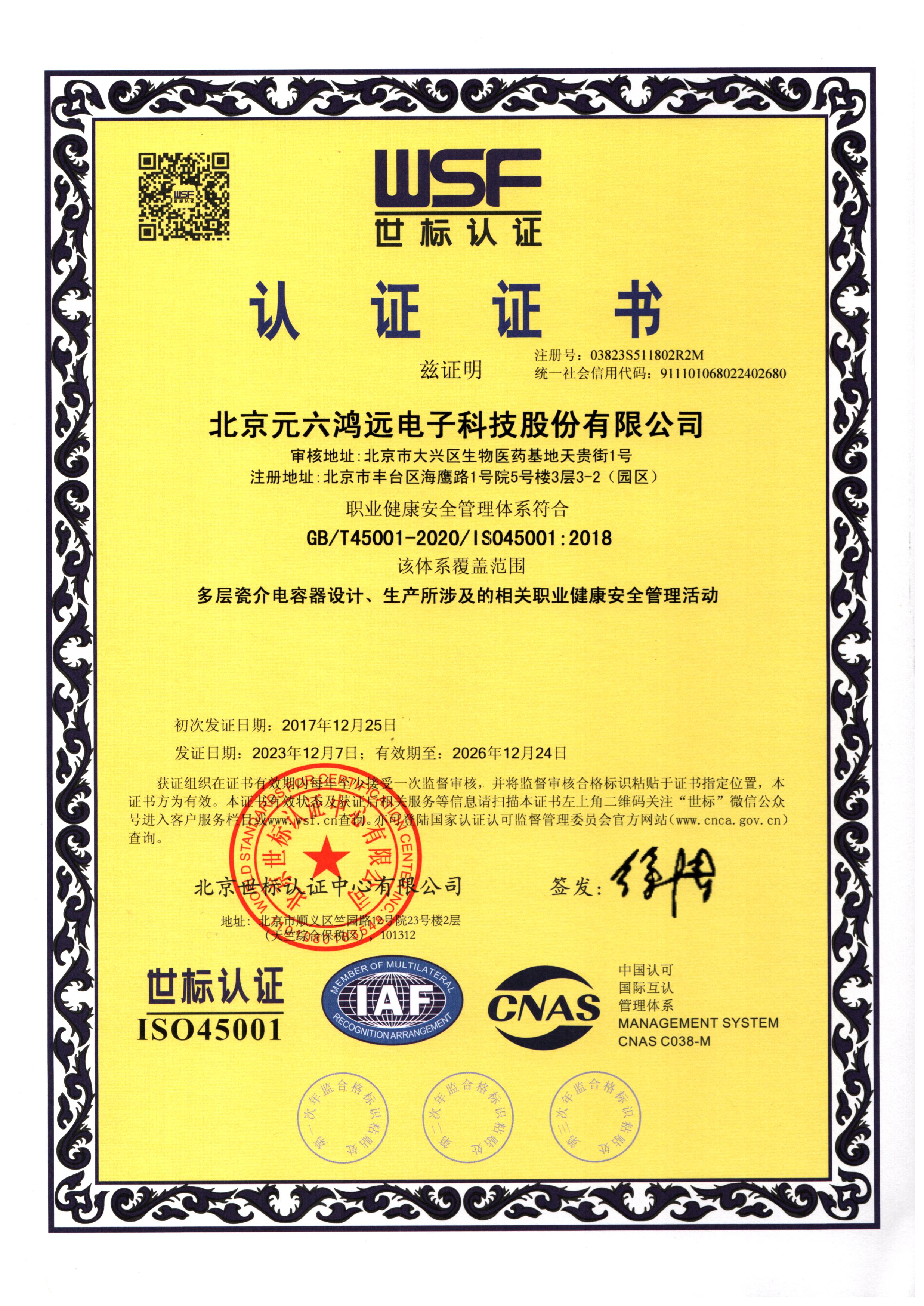 ISO45001职业健康安全管理体系证书